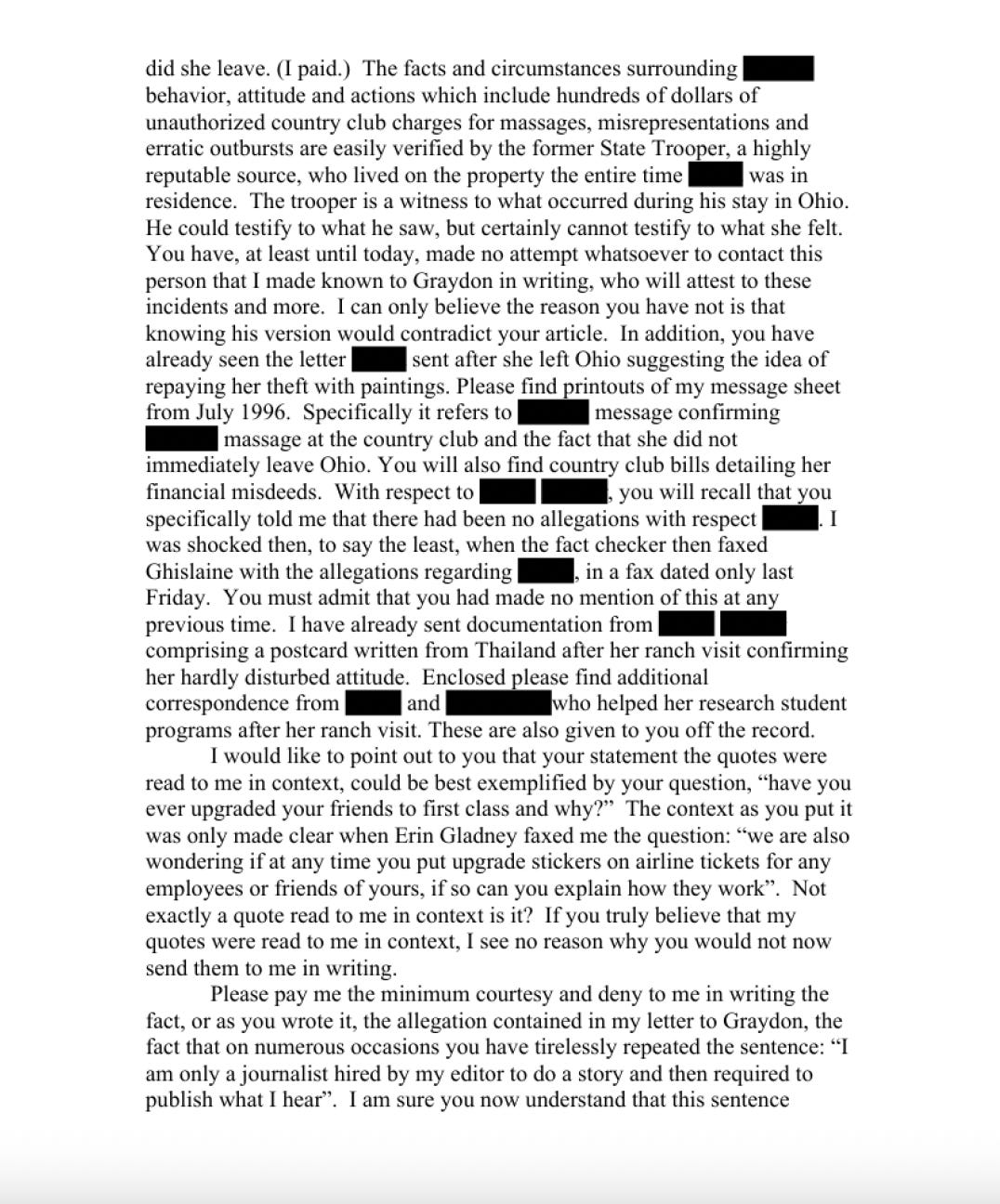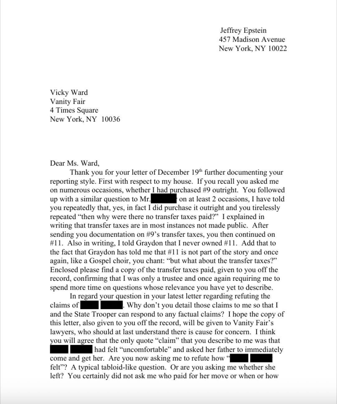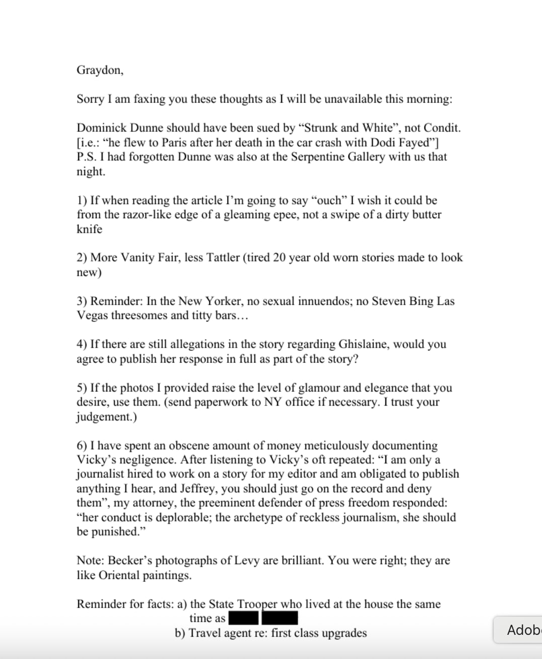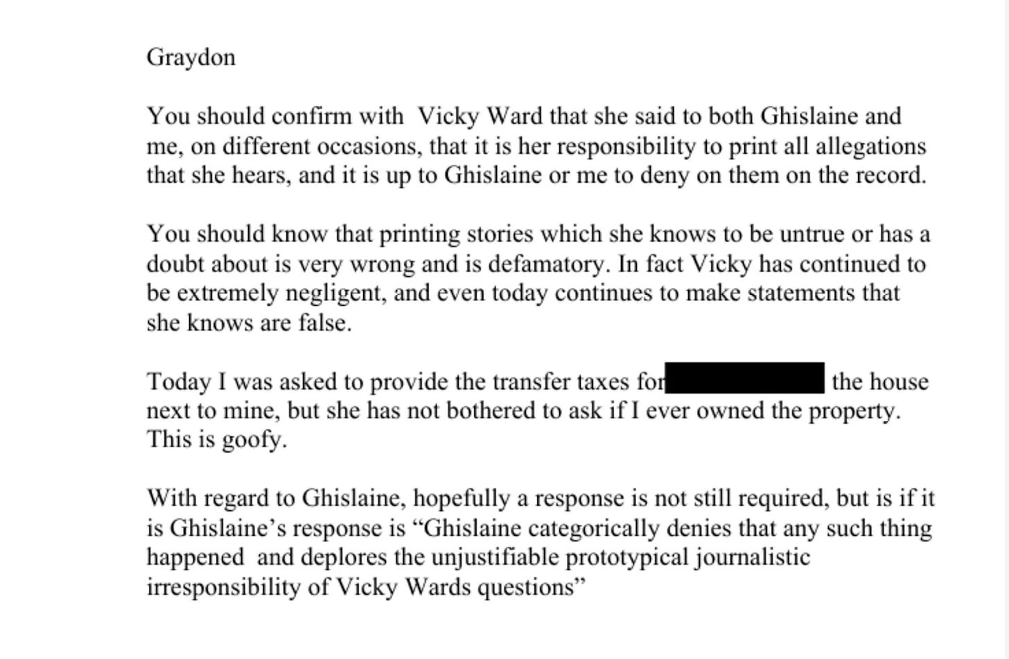 WTF? It appears from the above email it was Kennedy who drafted the letter below, then sent to me and to Vanity Fair. I don’t know if I ever received the “revision” mentioned in Maxwell’s email to him. But I do know that it was after the magazine received all these and after Epstein visited Graydon Carter in his office, that the Farmer sisters were dropped. (And, incidentally, I found this note from Epstein to Carter in the files alluding to that meeting and the photographs he provided for the article).