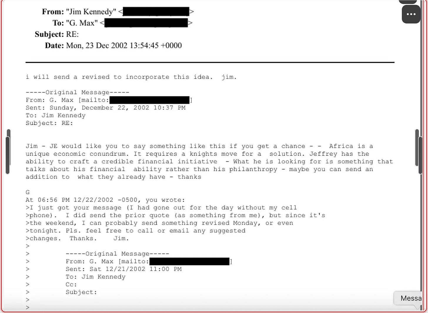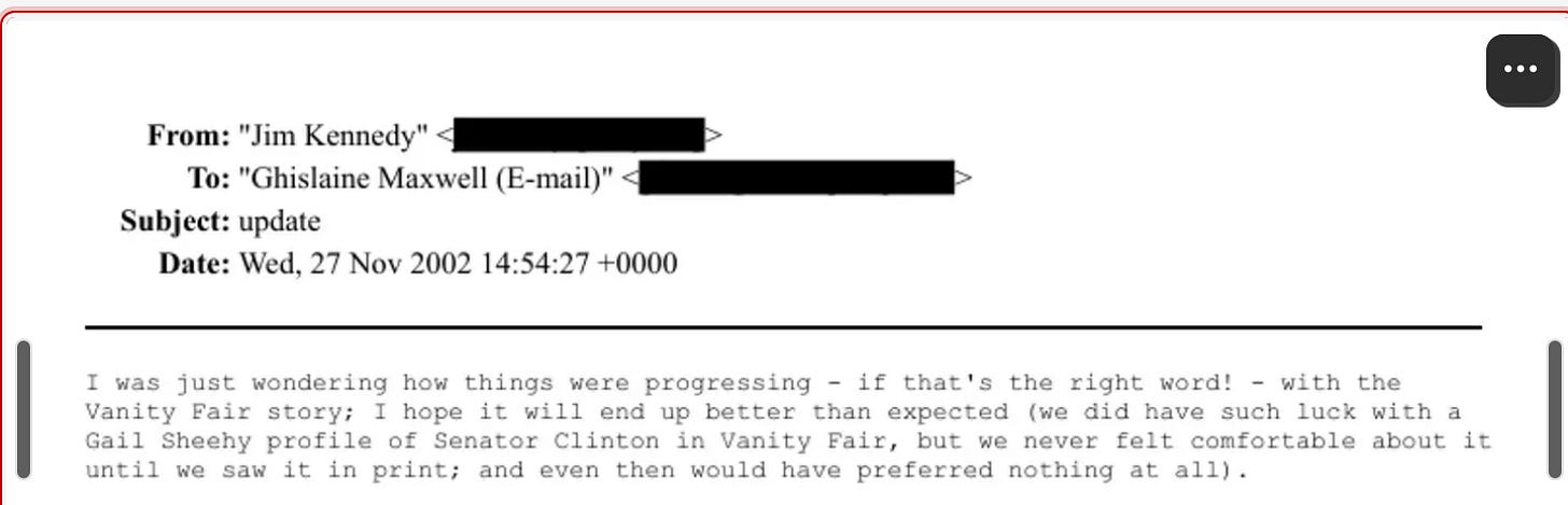 But I have discovered that in 2002, when Epstein went behind my back to my then boss Vanity Fair editor Graydon Carter, the person advising him and Maxwell on strategy, and even composing “letters’ to me and the magazine was Jim Kennedy, a former aide to Clinton’s White House Counsel, who went on to work for the Clinton Foundation.