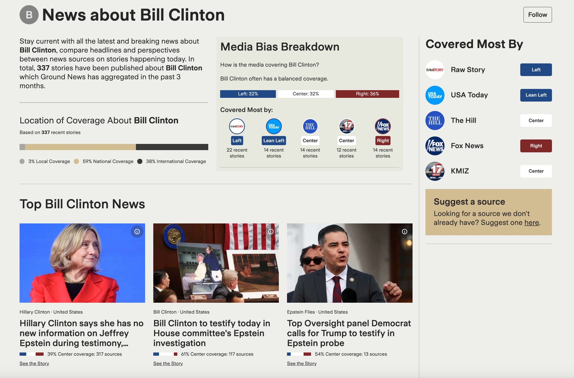 If you look at Ground News’ coverage page for Bill Clinton right now, you’ll see something fascinating.