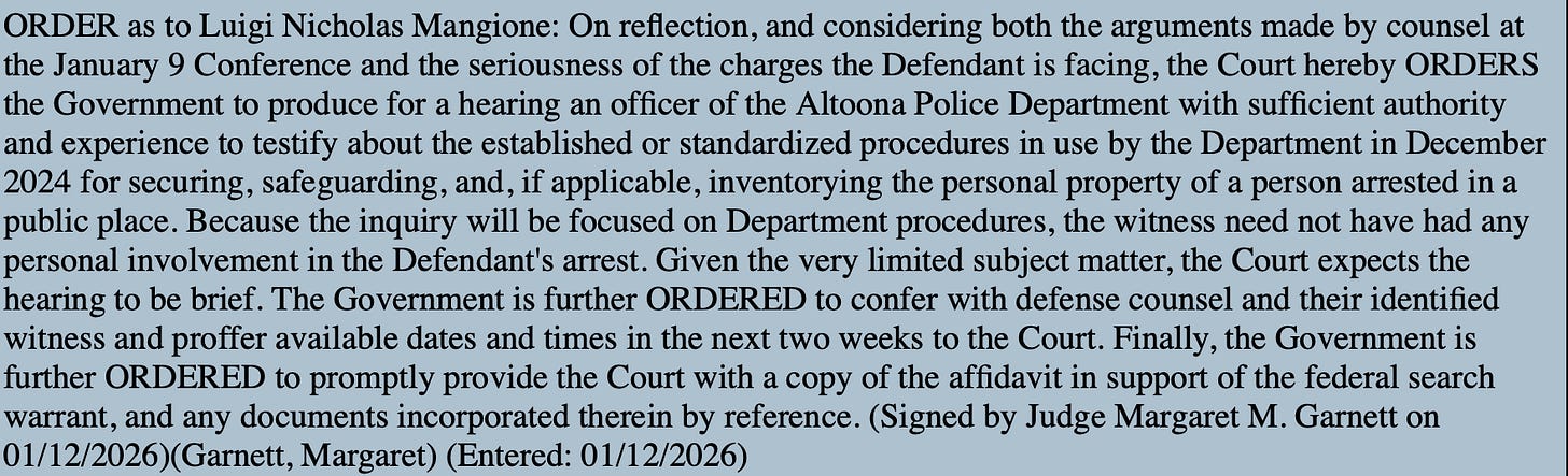 There’s breaking news in the Luigi Mangione case, which of course, is the topic of my next book with James Patterson: In the Federal case, in which the death penalty is on the line, the Hon. Margaret Garnett changed her mind over the weekend, and now wants to hold a brief evidentiary hearing in the next two weeks about police procedure in Altoona, Pennsylvania (Mangione was arrested in a McDonalds in the town). In her minute order she has said that she just wants one witness from Altoona to explain police procedure when it comes to “securing, safeguarding and inventorying the personal property of a person arrested in a public place”.