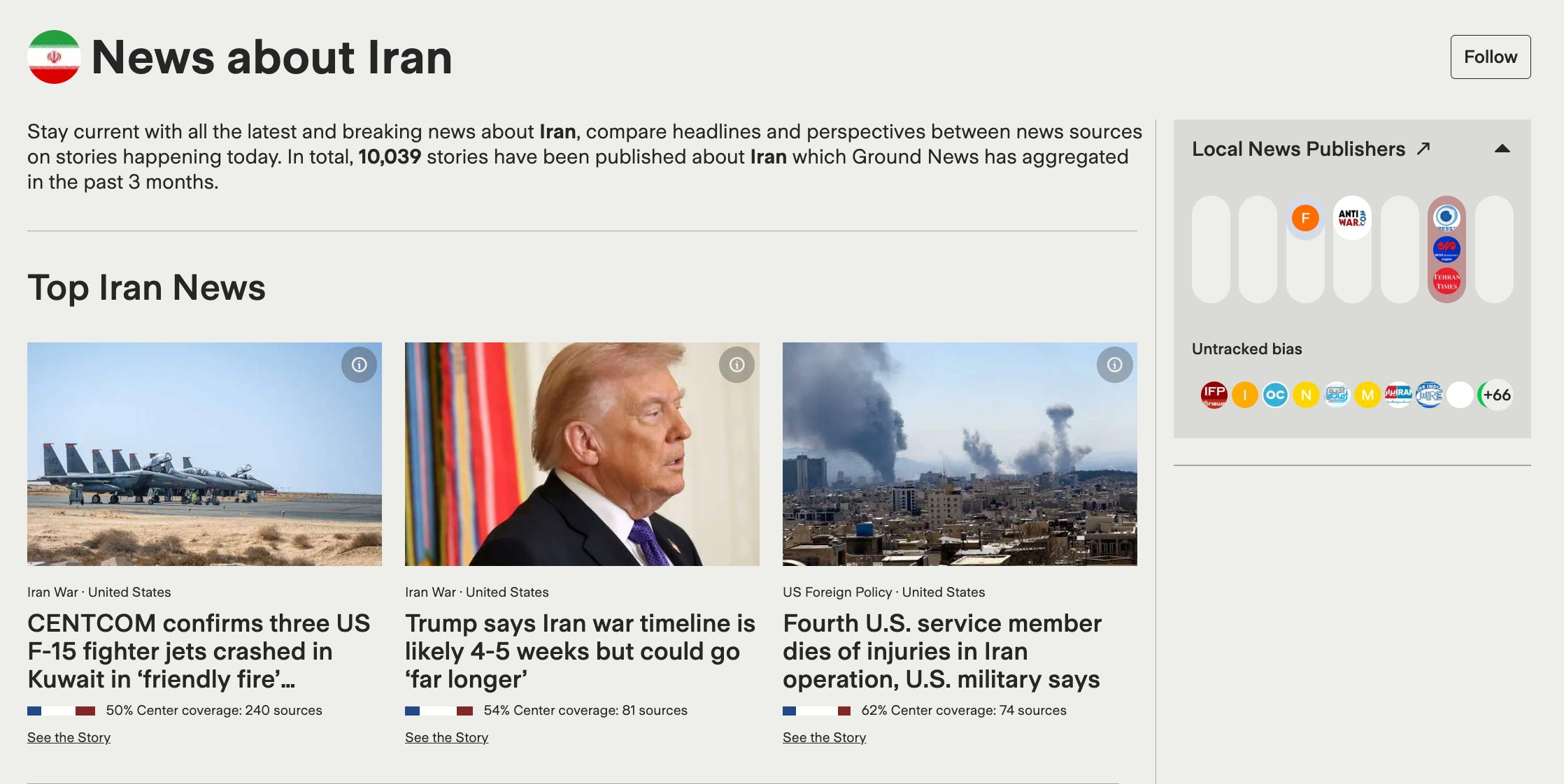 If you look at the Ground News “News about Iran” page right now, the numbers and headlines tell you how big and fast this story is moving: over 10,000 articles aggregated from dozens of sources in the past three months, and coverage from every corner of the political spectrum. That visual, with top stories on U.S. fighter jets, President Trump’s war timeline, and U.S. military casualties, isn’t just a snapshot of events, it’s a snapshot of how narratives are being framed differently across outlets.