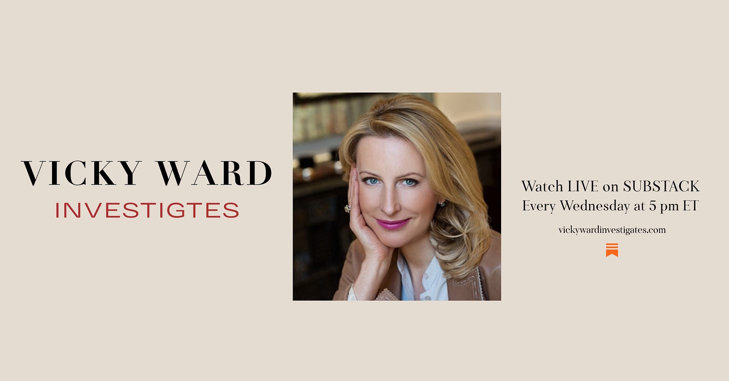 See you later at 5pm for My Live Video Chat with Michael Wolff!Tune In via the Substack AppVicky Ward InvestigatesApr 09, 2025613ShareGet more from Vicky Ward Investigates in the Substack appAvailable for iOS and AndroidGet the appShareMessage Vicky Ward InvestigatesLeave a commentThis Substack is reader-supported. To receive new posts and support my work, consider becoming a free or paid subscriber.SubscribePreviousNext