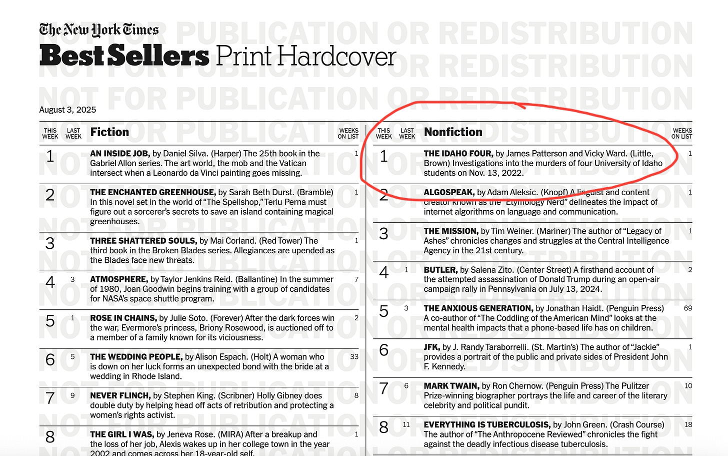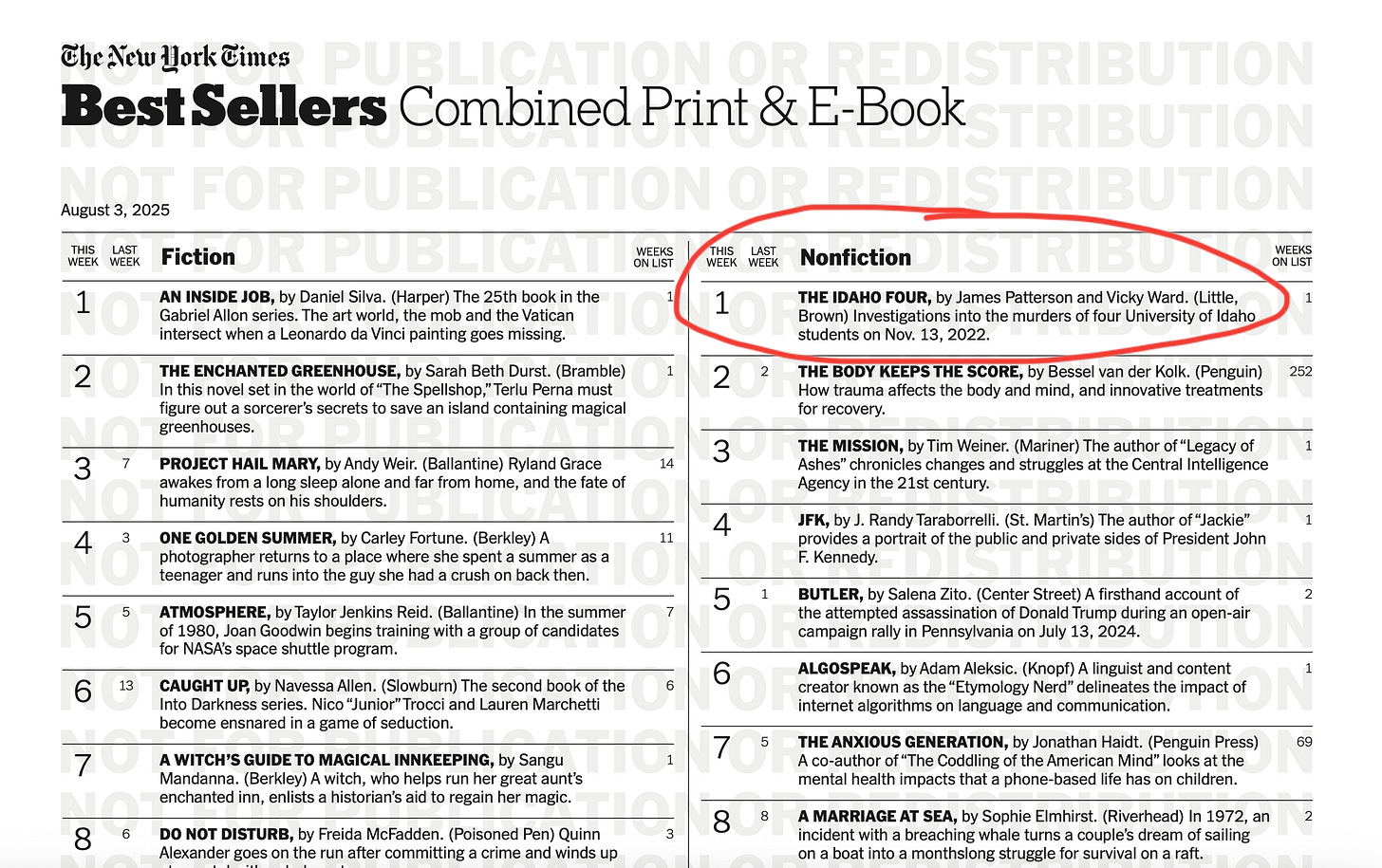 But, some breaking news: I just heard from James Patterson my co-author, that our book The Idaho Four is Number One on both the NYT Non-Fiction hardcover list and on the combined print and ebook nonfiction list - for a second week!