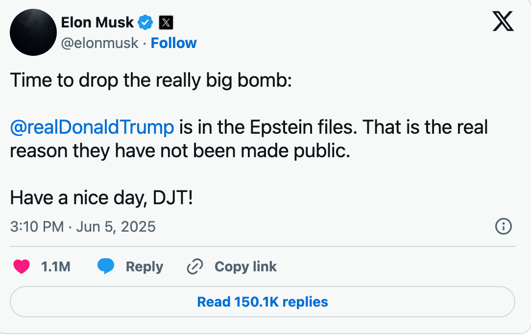Ever think it's all a ruse? I think Trump might have some shady dealings in his past, but he's a smart enough guy to cut ties when he sees a risk being higher than reward. That's what I think happened with Epstein, and Musk is just using the fact that Trump already was a known contact and "in his files". But for their relationship to sour so quickly makes me think it's all a show for some reason or other. Or perhaps a distraction. But it's not the main event.