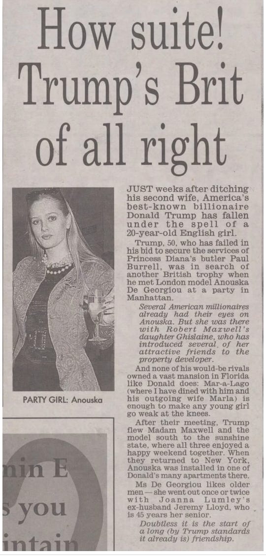 This morning I reached out to another woman both Trump and Epstein knew: Anouska de Georgiou, a British blonde former model who has spoken publicly about her horrendous experiences with Epstein, to whom she was introduced as a teenager by Ghislaine Maxwell.