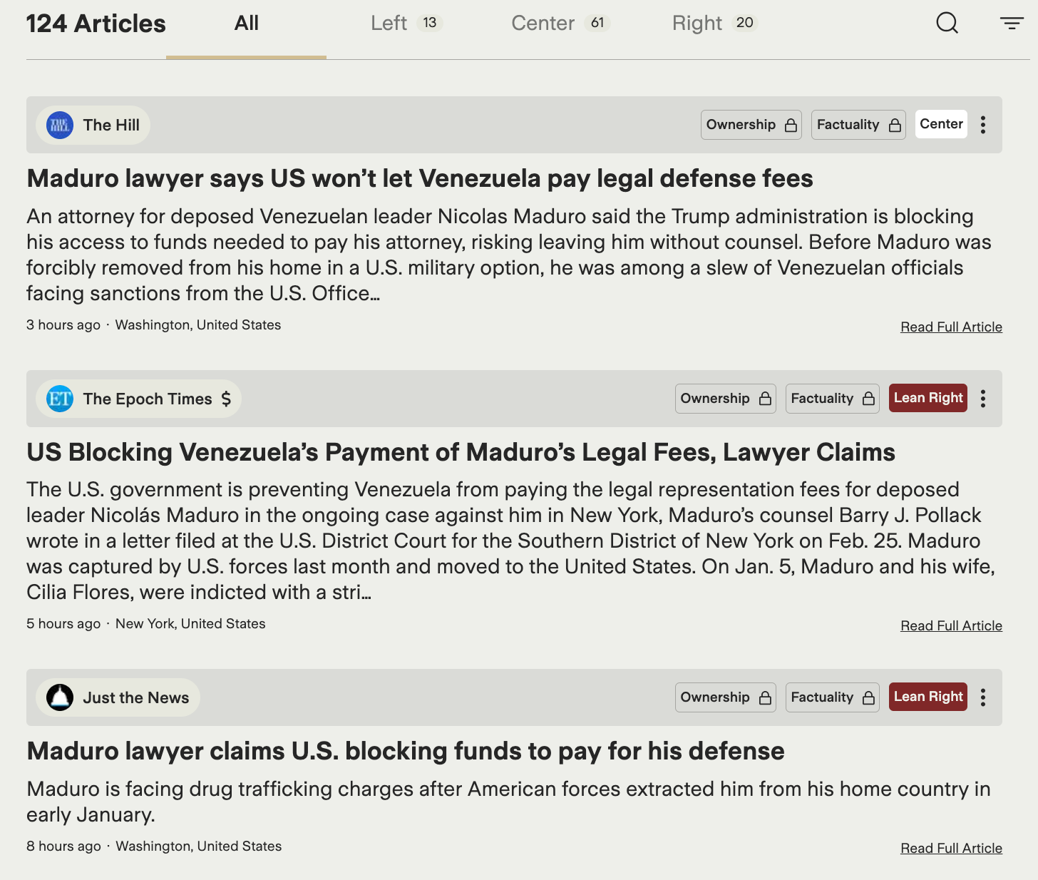 Ground News shows you how the same story — like the aftermath of Nicolás Maduro’s capture — is reported and framed differently across various news outlets. By presenting multiple perspectives side by side, and letting you filter by left‑leaning, center, or right‑leaning sources, it makes it easier to understand not just the events themselves, but how they are being presented.